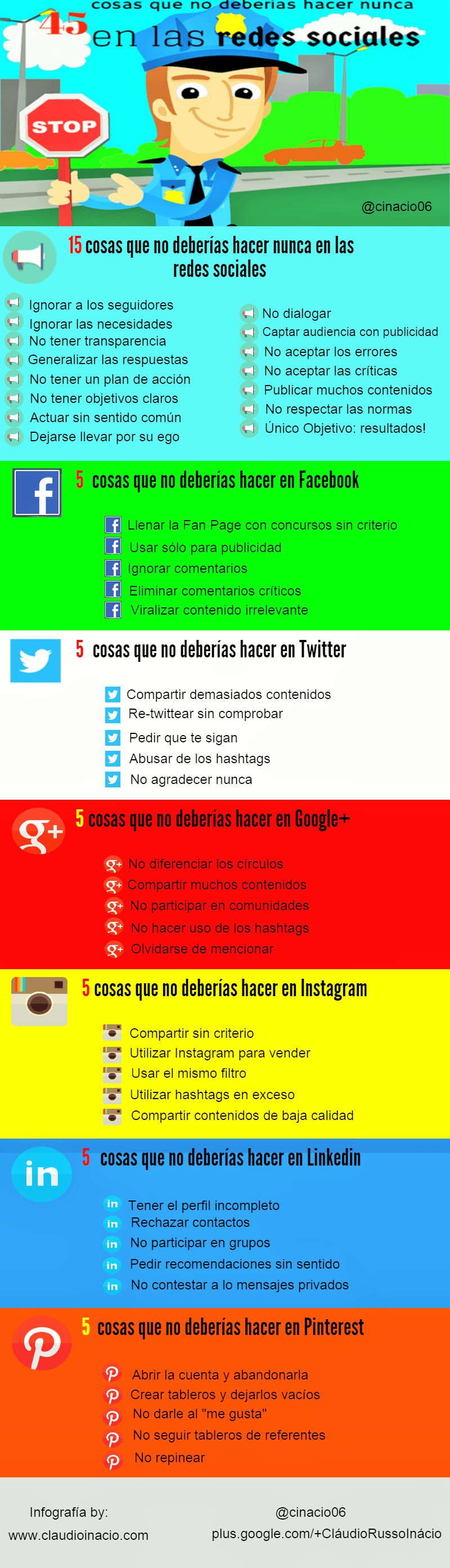 En este artículo he comentado una serie de acciones generales que no deberían realizarse nunca en las redes sociales, así como acciones que no debes realizar en algunas de las plataformas sociales más importantes.